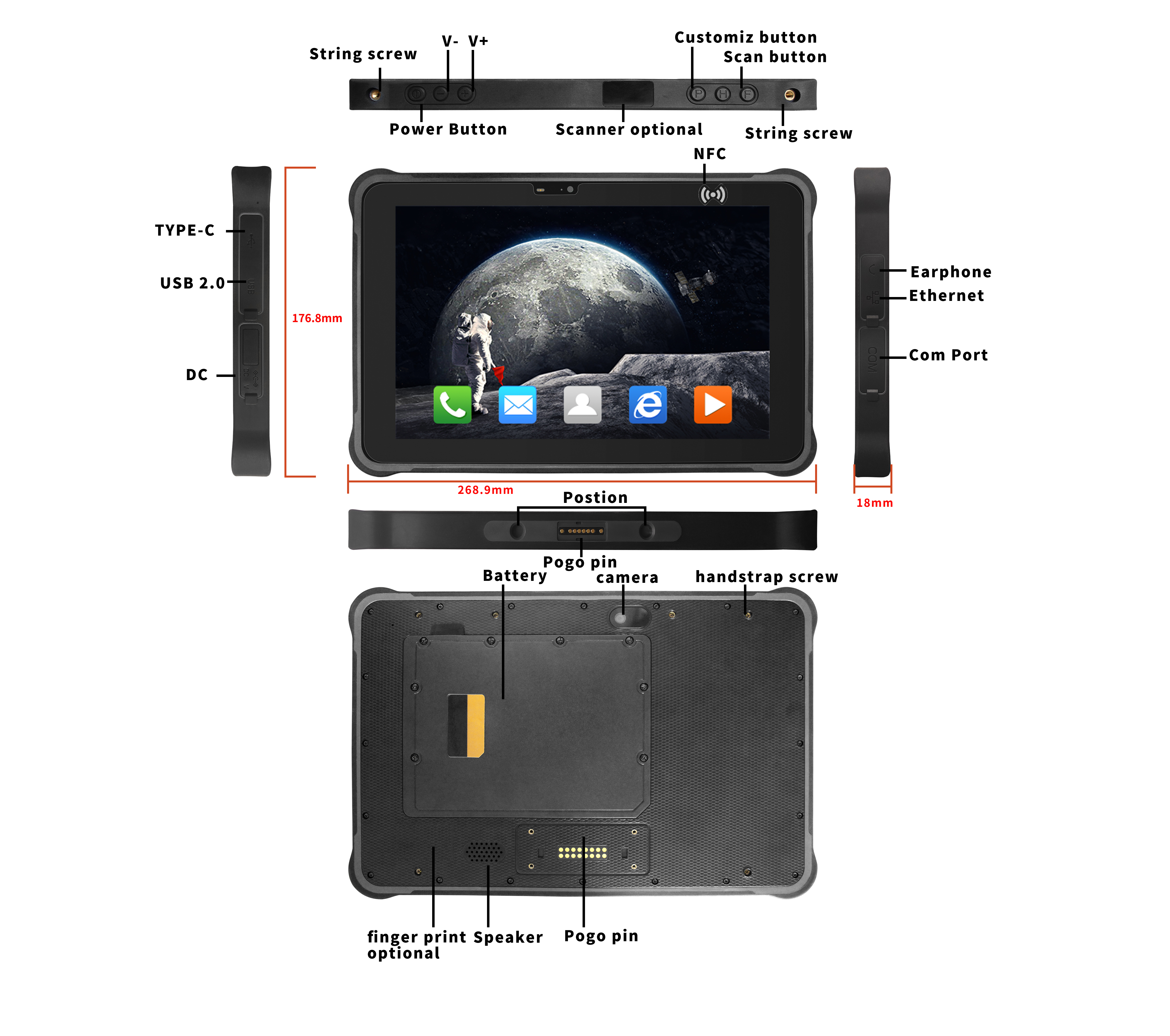 Type-C ×1(OTG対応);SIMカードスロット×1;TFカードスロット×1;イヤホンジャック×1;DCジャック×1(3.5×12mm);USB 2.0 ×1;RJ45×1;RS232×1 下部ポゴピン:USB 2.0;充電;RS232 背面ポゴピン:USB 2.0;RS232 |