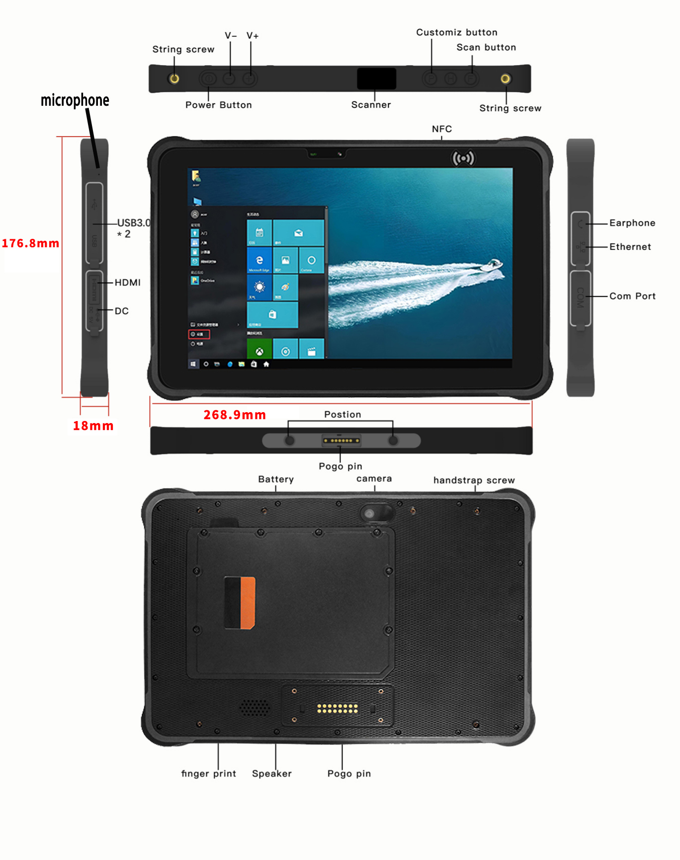 HDMI×1;SIMカードスロット×1;イヤホンジャック×1;DC×1(4.0×15mm);USB 3.0 ×2;RJ45×1;RS232×1 下部ポゴピン:USB 2.0;充電;RS232 背面ポゴピン:USB 2.0;RS232 |