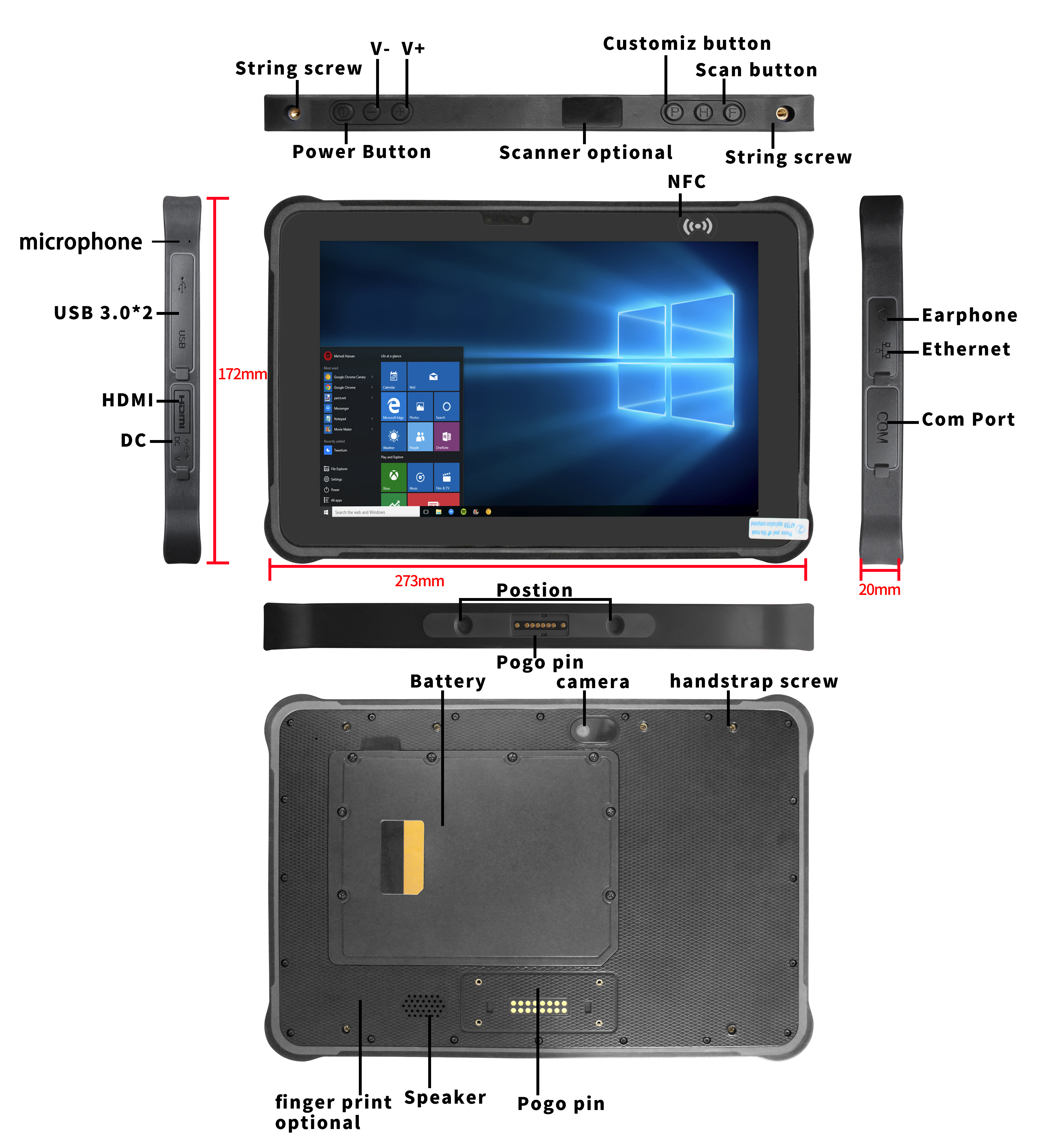 HDMI×1;SIMカードスロット×1;TFカードスロット×1(カスタマイズ品);イヤホンジャック×1;DCジャック×1(4.0×15mm);USB 3.0 ×2;RJ45×1;RS232×1 下部ポゴピン:USB 2.0;充電;RS232 背面ポゴピン:USB 2.0;RS232 |