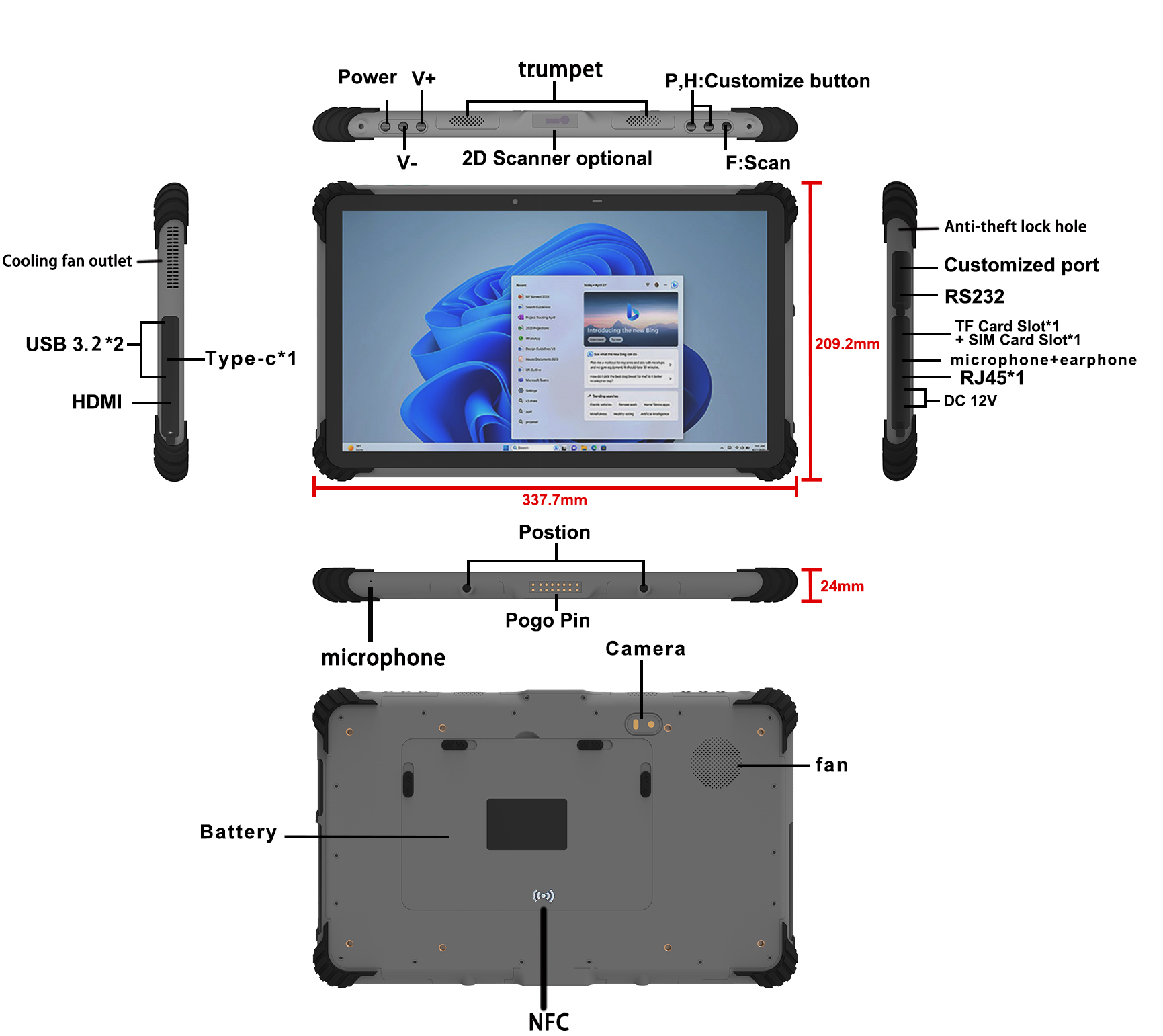 HDMI Type A×1;USB3.2×2;Type-C×1(急速充電対応);盗難防止ロックホール;航空インターフェース×2(カスタマイズ対応&RS232、RS232はTX RX GNDのみ対応);カードスロット(SIM+TF);ヘッドフォンジャック(∮3.5mm);イーサネットRJ45(10/100/1000M);DC電源インターフェース(∮4.0mm) 下部ポゴピン:USB 2.0;充電;RS232 |