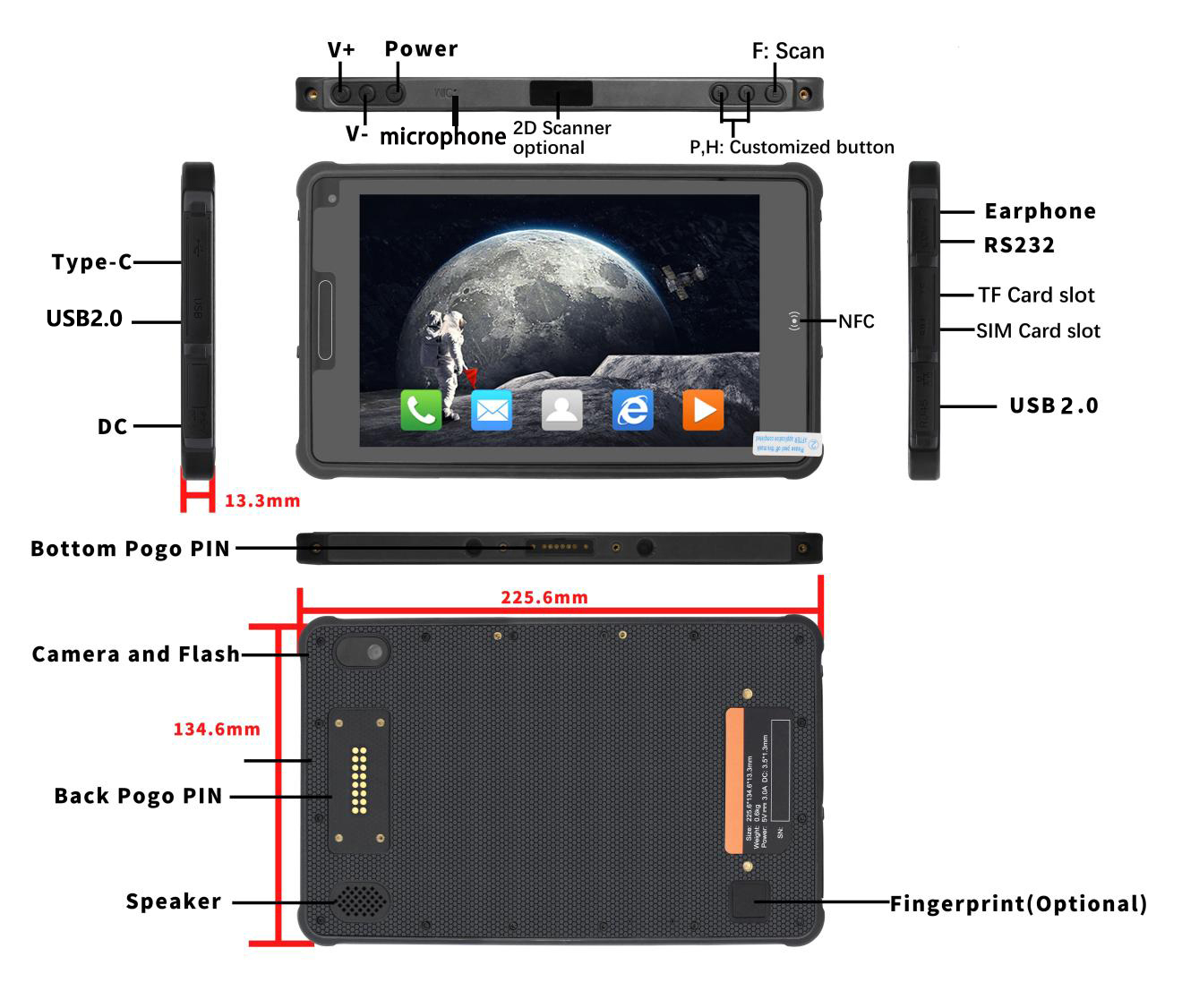 このAndroid 11の産業用頑丈なタブレットは、MT 8788オクタコアプロセッサー、8インチHDスクリーン、長時間のバッテリー寿命のための7800 mAhバッテリー、4 G、BeiDou位置決め、NFC、2 Dスキャンをサポートしています。IP 65保護、1.2メートルの落下耐性、-20℃から55℃の広い温度範囲、拡張可能なメモリ、そして十分な内部スペース(カスタマイズ可能)を誇っています。物流、化学、製薬産業での使用に適しています。