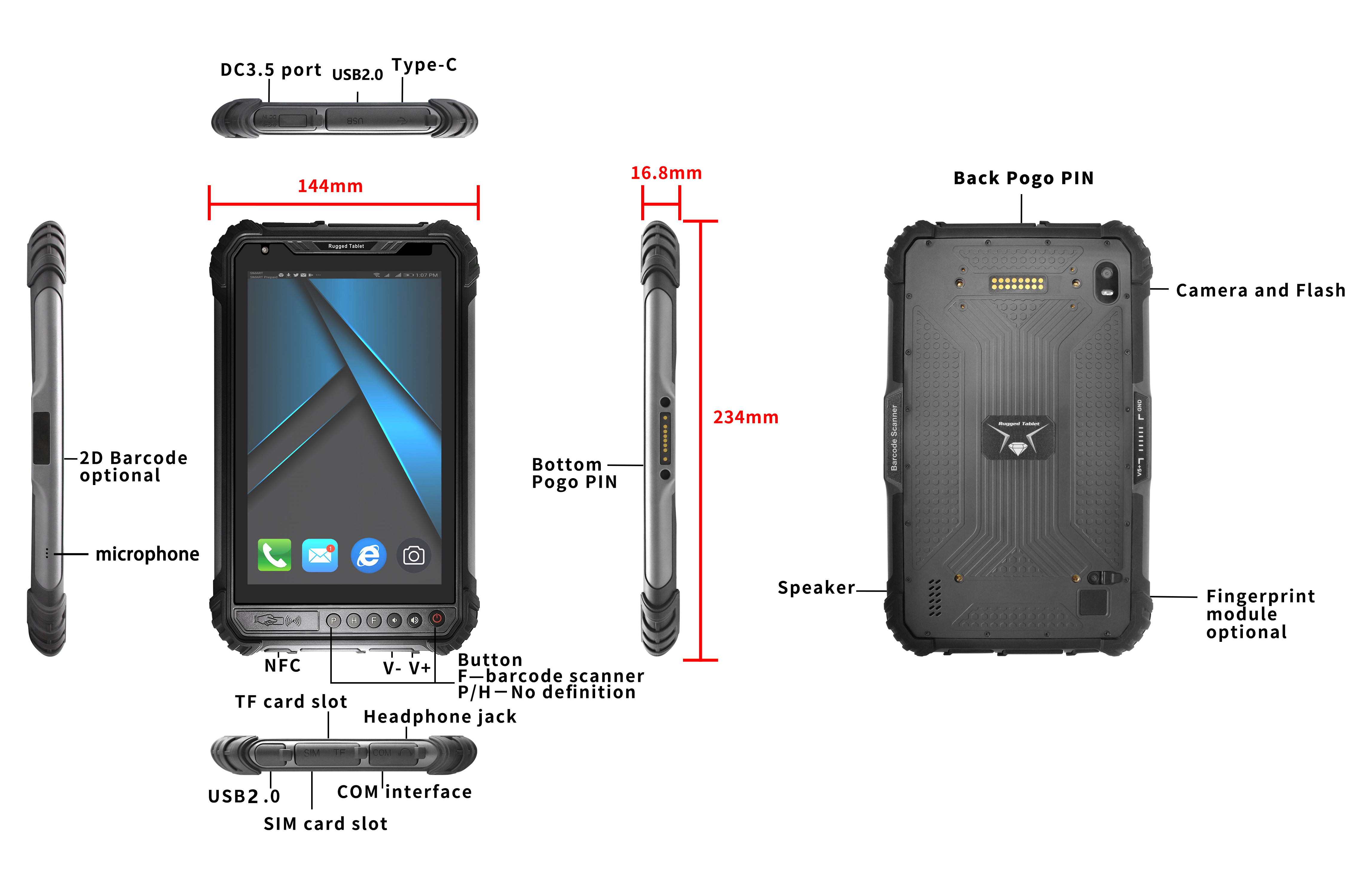 Type-C ×1(OTG対応)、SIMカードスロット×1、TFカードスロット×1、ヘッドホンジャック×1、DC電源ジャック×1(3.5×15mm)、USB 2.0 ×2、RS232×1(ミニUSB) 底面Pogopin:USB 2.0;充電;RS232 背面Pogopin:USB 2.0;RS232 |