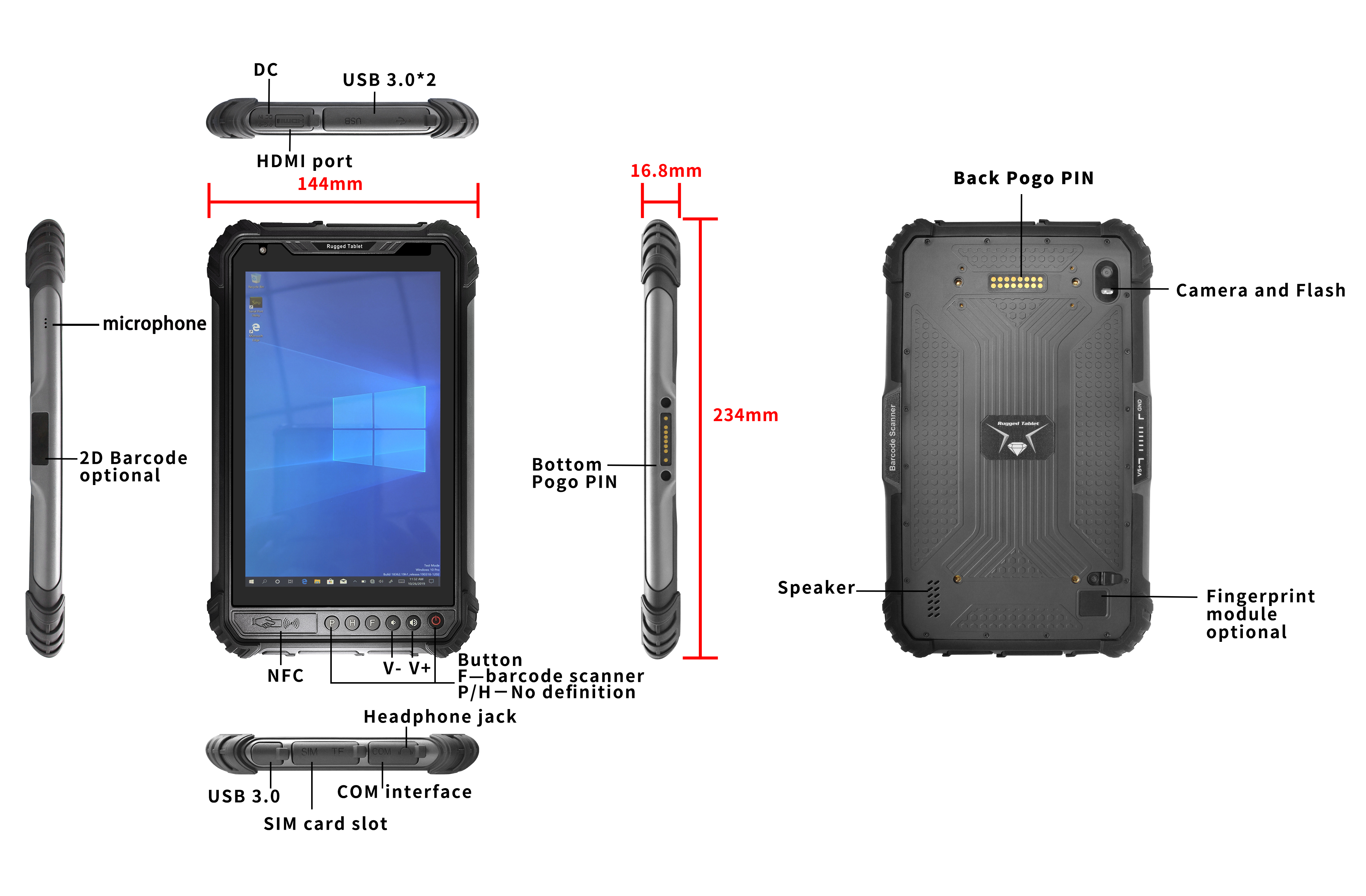 HDMI×1、SIMカードスロット×1、RS232×1(ミニUSB)、ヘッドホンジャック×1、DC電源ジャック×1(4.0×15mm)、USB 3.0×3 底面Pogopin:USB 2.0;充電;RS232 背面Pogopin:USB 2.0;RS232 |